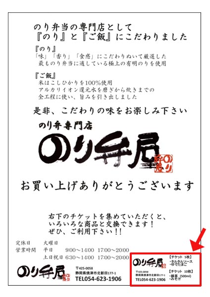 お弁当の掛け紙右下のチケットを集めていただくと、サイドメニューやトッピング商品と交換できます。ぜひ、ご利用ください。